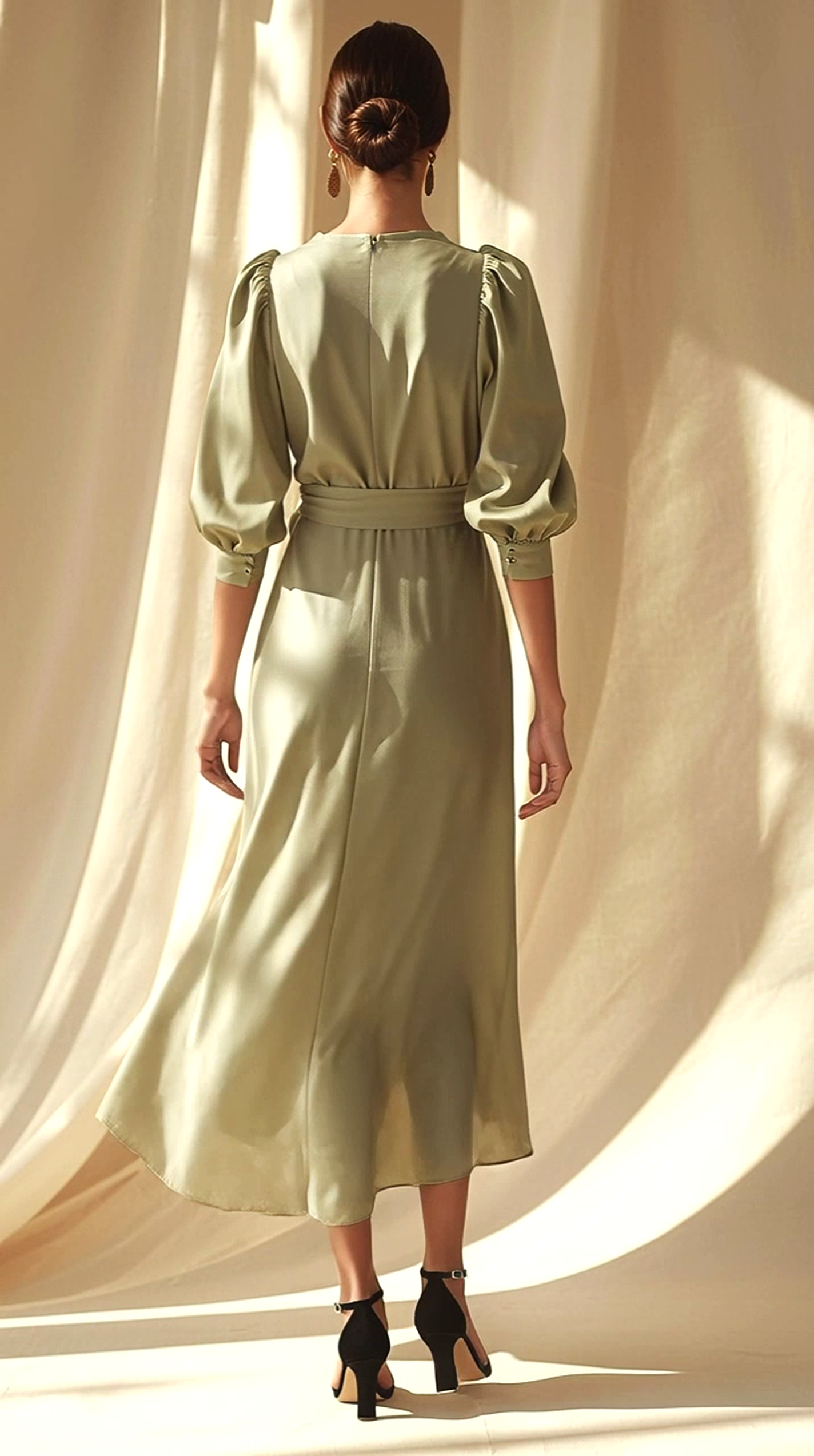 Sleeves: 3/4, slightly puffed, cuffed hem
